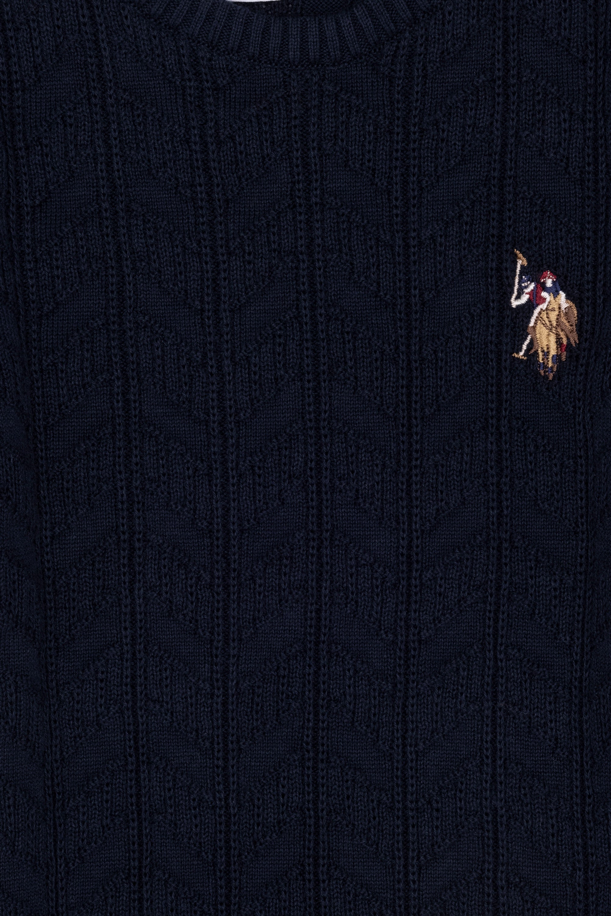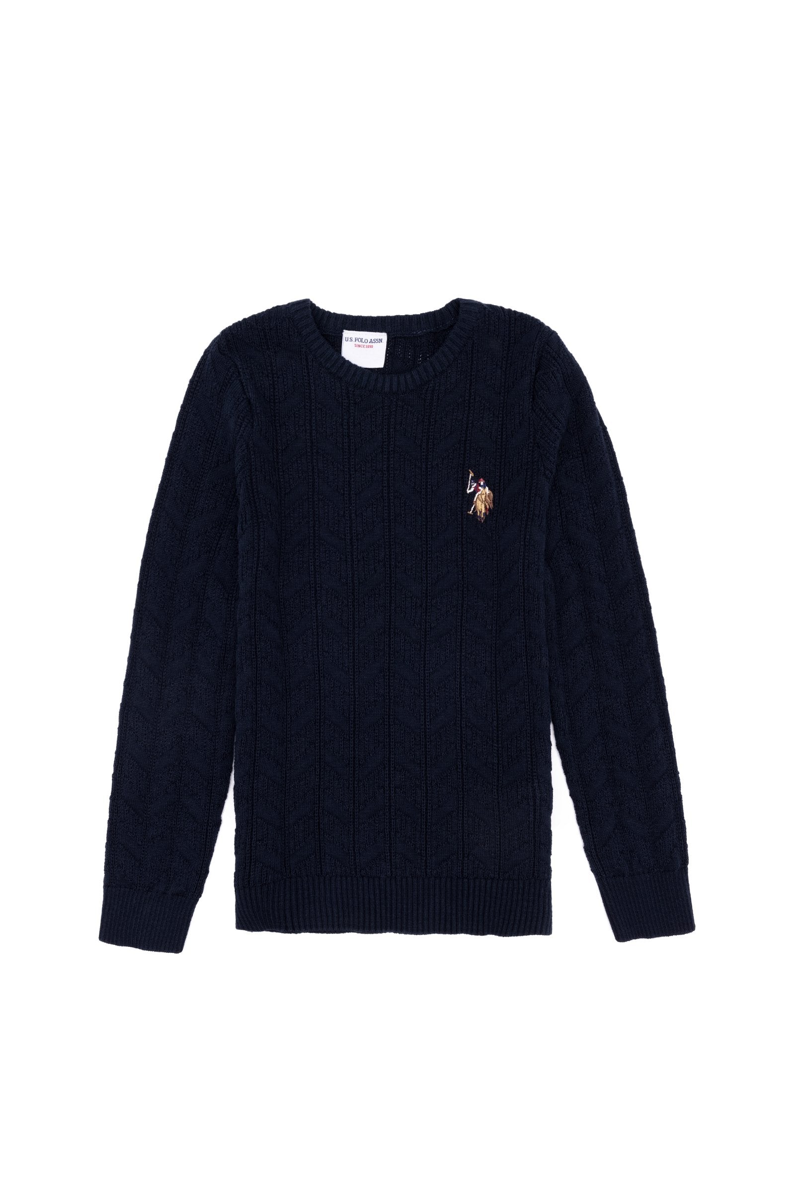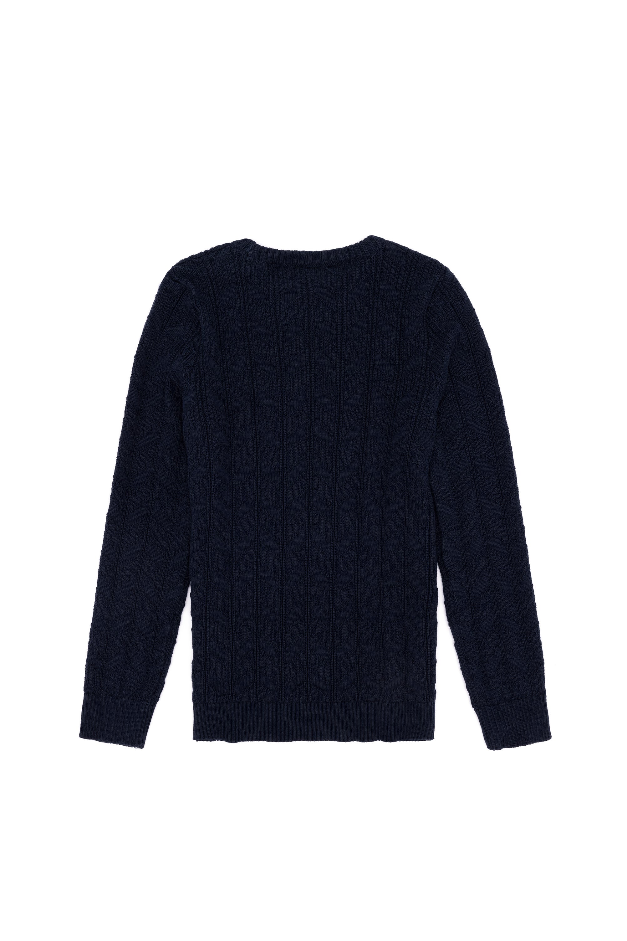 Pull bleu marine à col rond et manches longues.