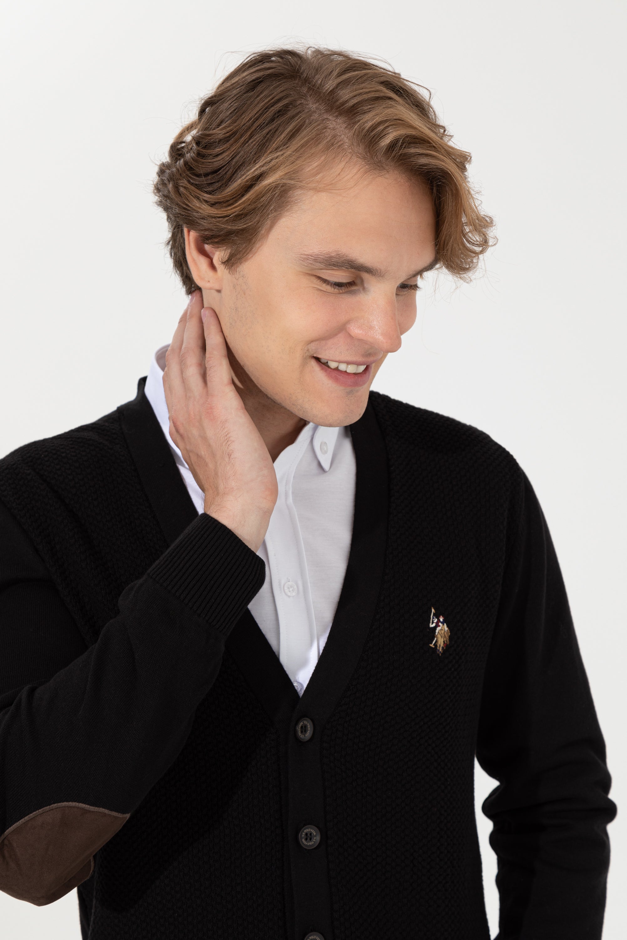 Gilet tricoté en fil de coton. Col en V et manches longues. Finitions côtelées.