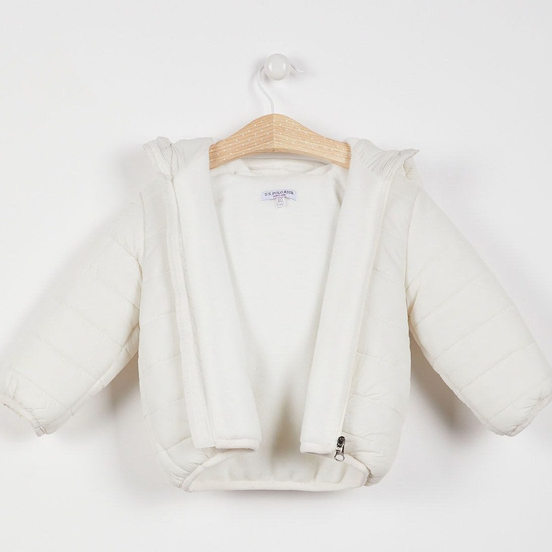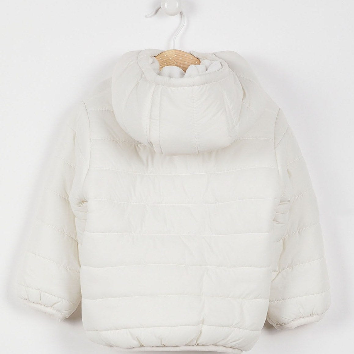 Blouson blanc à capuche et manches longues, double face. Fermeture zip sur le devant.